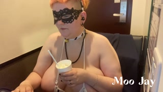 Just a chubby cow with giant tits eating snacks and replying to comments in a Japanese Internet cafe