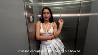 LATINA MILF NEIGHBOR fucks a BBC in the office elevator, takes off the condom, creampie, interracial