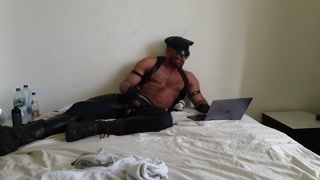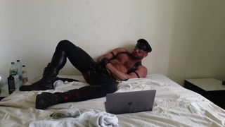 Leather hunk in chaps with gloves masturbating to porn (Paul Europe)