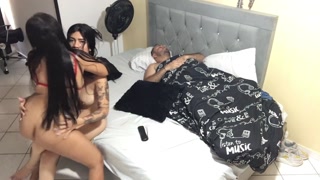 lesbian stepsisters play and masturbate with their stepdad in bed