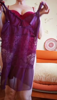 Mature Milf Tries on haul a Burgundy Bralette and a Purple Babydoll with Boobs out