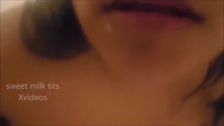 Milf playing with lactating milky tits in shower. Tit squeezing nipple lick