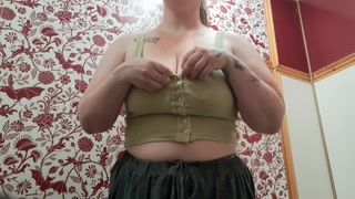 MILF trying clothes and playing with huge tits in a public fitting room