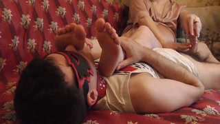 Mistress gives lingam massage to her while he enjoys her feet. Try not to cum