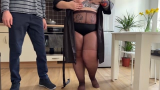 Mother-in-law masturbates her wet pussy in the kitchen and gets hot cum on her fat ass