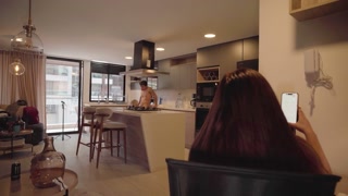 My stepdaughter catches me fucking her boyfriend in the kitchen and asks me for a bisexual threesome!