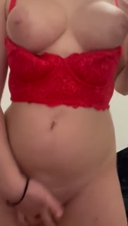 Naughty girl tries on her new red outfit and fucks her pussy