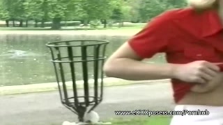 Nervous blonde milf flashing in the park