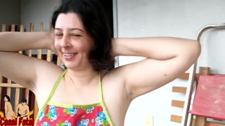 Nudist housewife cleaning the balcony