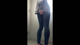OL wearing jeans in front of a public toilet desperate to pee