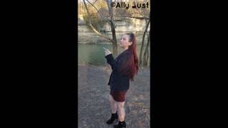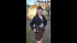 Opening a new pack and smoking by the water in a dress and jean jacket