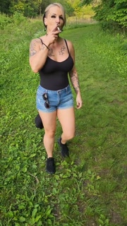 Out in the woods, smoking a cigarette and letting those massive tits free
