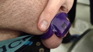 Peeing in public toilet wearing chastity with help from my gf