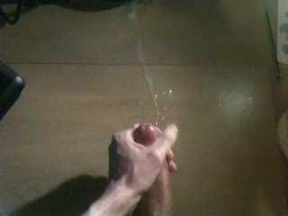 Polishing glans of huge uncut cock and shooting huge load across desk