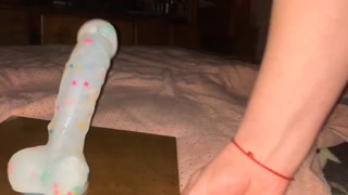 Preppy slut gets her confetti dildo wet and then licks it clean!