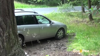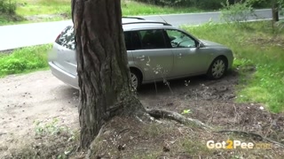 Public Peeing - A hot babe relieves herself next to a parked car