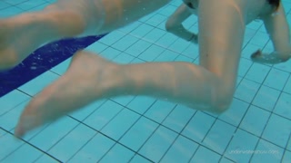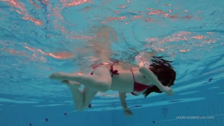 Red swimsuit beauty Katy with bushy pussy underwater