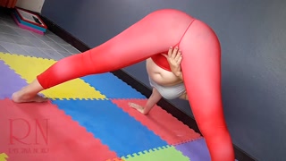 Regina Noir. A woman in yoga leotards practices yoga in the gym. Transparent red leotard yoga.