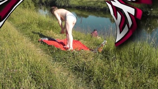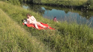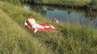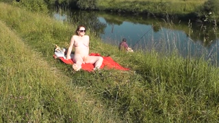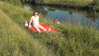 Riverside naked milf sunbathing is not shy about random fisher. Outdoors. Wild beach. Public nudity