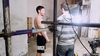 Roped down twink gets a gas mask and a rough handjob
