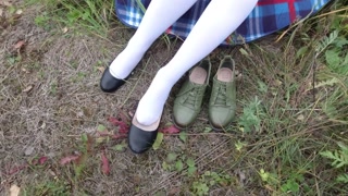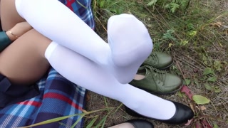 Schoolgirl in white socks changes shoes and shows her feet pantyhose knee socks