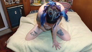 Sexy blue hair girl fingering her hairy pussy until she CUM, loud moaning