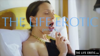 sexy brunette playing slowly with a glass dildo and sucking it like a cock