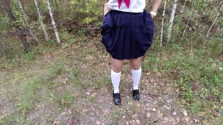 Sexy girl in school uniform white socks pissing outdoors pussy