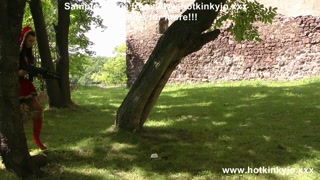 Sexy Red Riding Hood Hotkinkyjo self fisting her ass, gape & anal prolapse at Swiny Castle yard