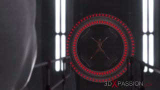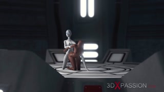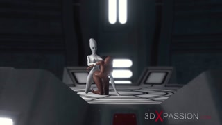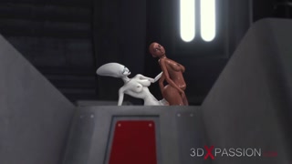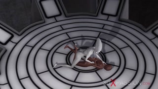 Sexy sci-fi female alien plays with a black girl in the space station