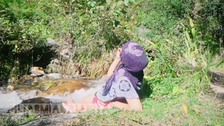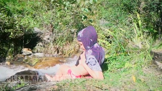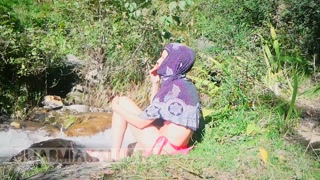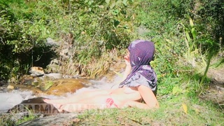 Shameless Muslim slut topless in hijab Smoking in nature