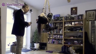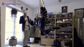 Shibari playtime: Girl in park bench pose suspension, breathplay, nipple clamp predicament!