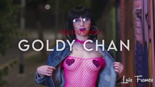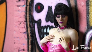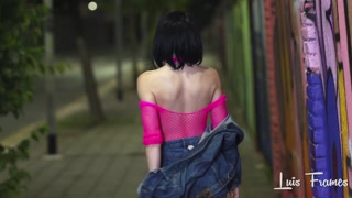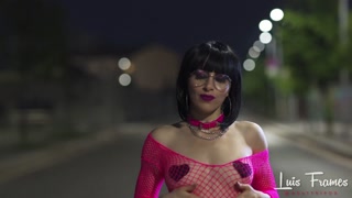 Skinny brunette in fishnets dances naked in public before sucking my huge cock