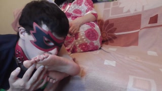 Slave on a leash worships the feet of his mistress