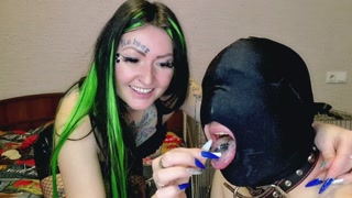 Smoking fetish. Dominatrix shakes cigarette ash on her slave's head and mouth.