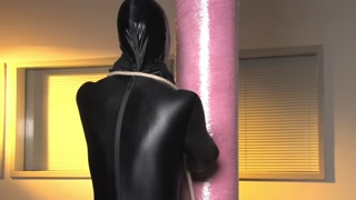 Spandex zentai babe with fishing line tied to concrete post