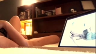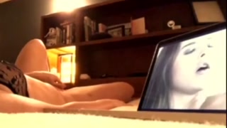 Standing in front of mirror masturbating, watching porn and fucking dildo