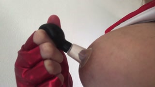 Submissive Harley Quinn pumps her nipples and milks her tits for Daddy