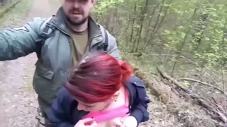 Sucking and fucking in the park on the path with a red beauty