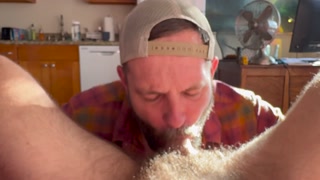 Sucking off a handsome hairy friend.
