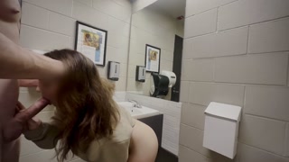 Tall stud fucks big ass petite brunette in a public bathroom