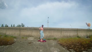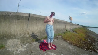 The girl undresses, walks and masturbates near the road by the lake