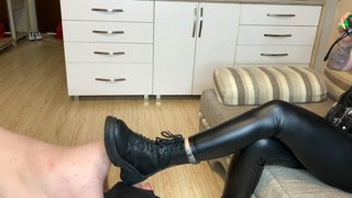 The slave licks the dirty boots of his Mistress. Boots fetish