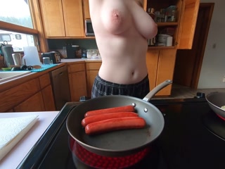 Topless housewife takes on 3 hot wieners at once