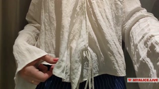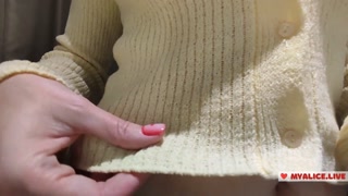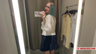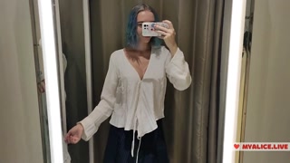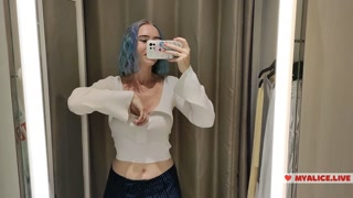 Trying on translucent sexy clothes in a shopping center. Look at me in the fitting room and jerk off
