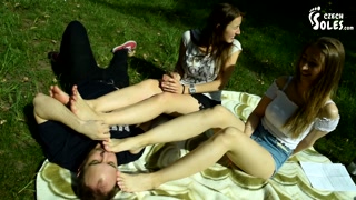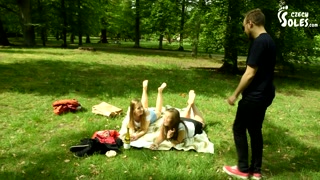 Two barefoot girls in park having their feet worshiped by a stranger (foot worship, public feet)