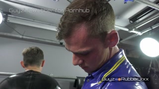 Two guys in tight shiny rubber & orange boots; arse fingering, jerking each other, dildos, rimming