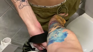 two young guys jerking off big dicks in a public toilet