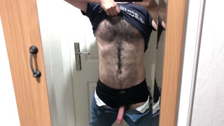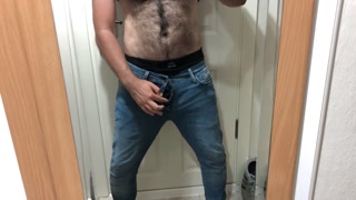 Very hairy guy cock coming out of jeans